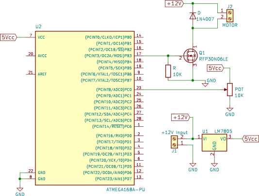 El ancho de pulso de la señal PWM lo modificamos leyendo el valor de tensión que llega a una de las entradas analógicas del microcontrolador mediante un potenciómetro de 10K.
